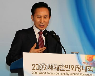 李明博當(dāng)天出席在首爾的華克山莊舉行的2009年世界韓人會(huì)長(zhǎng)大會(huì),通過(guò)賀詞說(shuō)出了此番話。