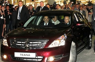 中新網(wǎng)6月3日電 日本日產公司在圣彼得堡設立的新工廠向參加工廠開幕式的來賓展示了該廠生產的日產天籟(Nissan Teana)車。俄羅斯總理普京2日坐到這輛車的駕駛員位置上,開車帶該廠廠長兜了一圈。