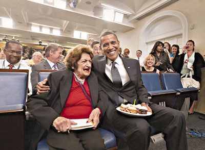 8月4日是奧巴馬48歲生日,也是赫斯特報系專欄作家湯馬斯的89歲生日。白宮首席發(fā)言人吉布斯在白宮新聞發(fā)布室內(nèi)進(jìn)行每日簡報,大批記者聚集向他提問,此時,奧巴馬捧杯形蛋糕入內(nèi),帶領(lǐng)記者團(tuán)為湯馬斯唱生日歌。