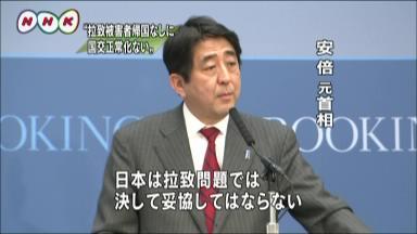 據(jù)日本NHK電視臺(tái)18日?qǐng)?bào)道,日本前首相安倍晉三在美國(guó)華盛頓演講時(shí)明確指出,關(guān)于人質(zhì)綁架問(wèn)題日本絕對(duì)不會(huì)就此妥協(xié)。只要享有人權(quán)的被綁架者歸國(guó)無(wú)法實(shí)現(xiàn),日本不會(huì)同朝鮮恢復(fù)邦交正;,而朝鮮跨越日本領(lǐng)土發(fā)射導(dǎo)彈的挑釁行為絕對(duì)無(wú)法容忍。