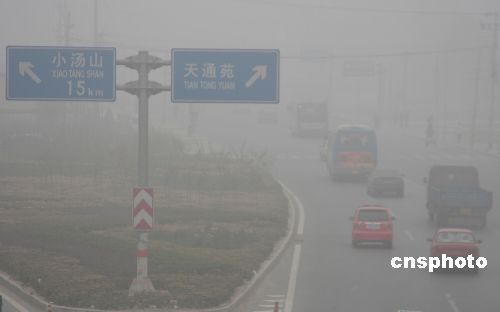 北京大霧蒙蒙,彌漫著的霧氣較前日更加濃重。中新社發(fā) 吳芒子 攝
