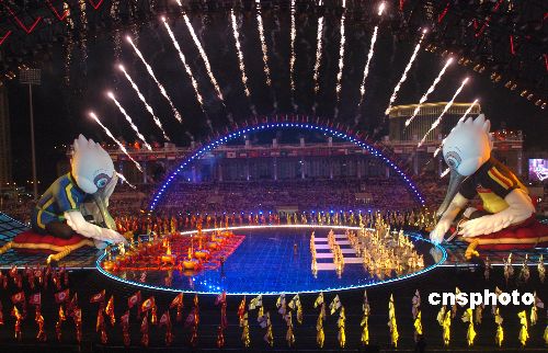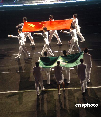 十月二十六日晚,中華人民共和國國旗和澳門特別行政區(qū)區(qū)旗升起在澳門運動場,第二屆亞洲室內運動會開幕式隆重舉行。澳門特首何厚鏵、國際奧委會主席羅格等嘉賓出席開幕式。開幕式上舉行了“和諧澳門,快樂竟技”大型文體匯演。第二屆亞洲室內運動會將舉行十七個大項,一百五十一個小項非奧運項目比賽和三個示范項目表演,是澳門主辦的規(guī)模最大,要求最高,比賽項目最多的國際綜合運動會。 中新社發(fā) 史利 攝