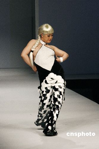 2007年11月4日,中國國際時裝周舉行半狄熊貓時裝發(fā)布會。芙蓉姐姐以模特身份展示了半狄熊貓時裝“網(wǎng)絡紅人”造型,首次在中國國際時裝周亮相的芙蓉姐姐在T臺上大秀“S”造型,由于時裝上身過小,芙蓉姐姐在盡情舞蹈中胸部大泄春光。中新社發(fā) 魯谷 攝