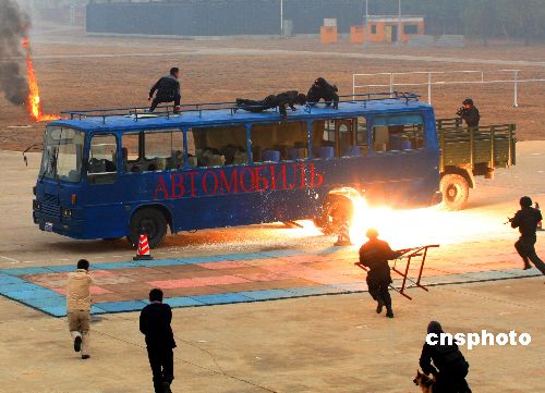 中國武警部隊(duì)特勤大隊(duì)11月12日上午在北京進(jìn)行反恐演習(xí),此次訓(xùn)練科目表演包括搏擊拳、射擊、摔擒、一招制敵、戰(zhàn)術(shù)基礎(chǔ)動(dòng)作、五人戰(zhàn)斗小組情況處置演練等項(xiàng)目。來自42個(gè)國家的59名駐華武官,參觀了武警官兵的表演,并參觀了大隊(duì)部分武器裝備。這支組建于2002年12月的部隊(duì)被命名為“雪豹突擊隊(duì)”,組建于二00二年十二月,是美國“9·11”事件后,中國為防范和打擊恐怖主義而專門組建的反恐特種部隊(duì),共四百余人,主要擔(dān)負(fù)處置重大恐怖事件中心區(qū)武力突擊任務(wù)。他們先后四次參加國家級(jí)反恐綜合演習(xí),并參加了“合作-二00七”中俄聯(lián)合反恐演習(xí),目前已初步具備了反恐制勝的作戰(zhàn)能力。