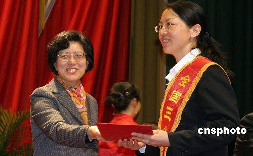 中華全國(guó)婦女聯(lián)合會(huì)副主席洪天慧(左)向中國(guó)空間技術(shù)研究院“嫦娥一號(hào)”衛(wèi)星天線分系統(tǒng)主任設(shè)計(jì)師孫大媛頒發(fā)“全國(guó)三八紅旗手”榮譽(yù)證書(shū)。