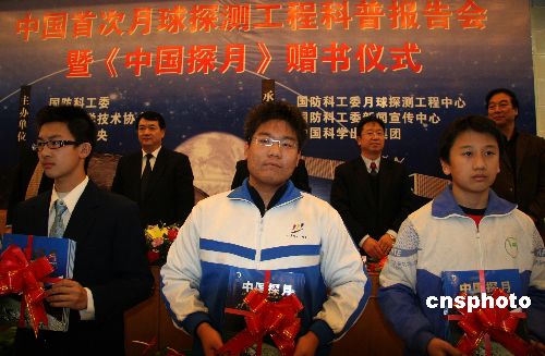 十二月十四日下午,國防科學(xué)技術(shù)工業(yè)委員會(huì)、中國科學(xué)技術(shù)協(xié)會(huì)、共青團(tuán)中央在此間中國科技館舉行贈(zèng)書儀式,向北京青少年學(xué)生代表贈(zèng)送由國防科工委月球探測(cè)中心組織專家編寫的《中國探月》一書,以激勵(lì)青少年學(xué)生更多了解中國首次月球探測(cè)工程相關(guān)知識(shí),關(guān)注航天科技發(fā)展、崇尚科學(xué)、積極探索未知領(lǐng)域。中新社發(fā) 孫自法 攝