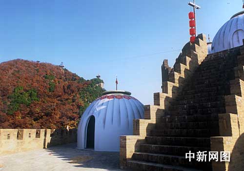 唐營:唐武德三年,秦王李世民在綿山雀鼠谷大戰(zhàn)劉武周時(shí),曾在綿山安營扎寨。寨上帥旗高揚(yáng),二十八宿旗(東方七面青旗、北方七面皂旗、西方七面白旗、南方七面紅旗),迎風(fēng)獵獵。四周有諸多兵士各持旌旗,寶蓋、大戟、長戈、黃鉞、白旄、朱幡、皂、纛,十分威武雄壯。唐營依嶺而上,設(shè)有三道關(guān)隘,第一道為硬弓強(qiáng)弩,第二道為擂木砲石,第三道為長槍大刀,葛藤盾牌。此處設(shè)有中軍帳,為李世民議事處。陳列有虎威椅、虎符、令牌、令旗;李世民佩帶的寶劍、使用的青龍大刀;軍事地圖等。四周設(shè)有前、后、左、右軍帳,陳列有文武大臣裴寂、程咬金的兵器、兵書及軍用品等。唐營一排排兵器架上,刀槍劍戟、斧、鉞、鉤、叉锃光瓦亮,一個(gè)個(gè)守營軍士全身披掛,威風(fēng)凜凜。