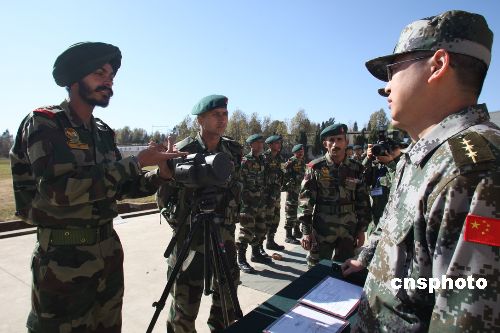 圖為印軍向參加訓(xùn)練的中國士兵講解夜視儀的性能。