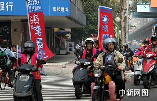 一月十日,一名“立委”候選人的選務(wù)團(tuán)隊(duì),將拉票彩旗插在摩托車(chē)上穿梭于臺(tái)北街頭造勢(shì)。 作者:孫自法