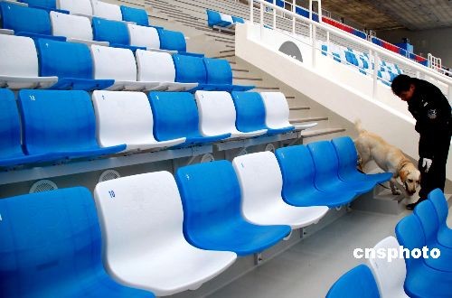 警察帶警犬檢查北京奧運(yùn)場(chǎng)館“水立方”座椅設(shè)施。