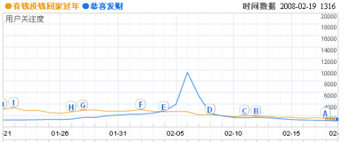 “艷照門”事件也成為春節(jié)期間的熱門話題。報告指出,每天有數(shù)百萬網(wǎng)民搜索相關(guān)關(guān)鍵詞,更有超過千萬的人在網(wǎng)絡(luò)上搜索圖片。在百度指數(shù)中,陳冠希的關(guān)注度1月內(nèi)猛增80倍,而阿嬌的關(guān)注度也增加了30倍,事件的其余女主角張柏芝、陳文媛的關(guān)注度也增加了10倍以上。