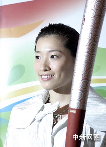 北京奧運(yùn)會(huì)火炬希臘傳遞的第一位中國(guó)火炬手羅雪娟3月23日晚身著白色禮服出席晚宴,圖為其手持祥云火炬接受媒體拍照。中新社記者:王歡