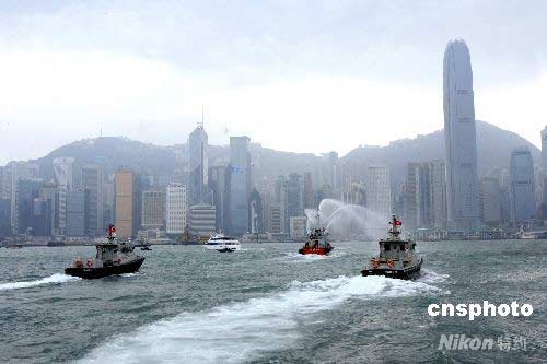 香港舉行北京奧運火炬?zhèn)鬟f路線預演,維港海上數艘警用巡邏艇、快艇、護送火炬?zhèn)鬟f游輪過海,消防船在維港射水致意、飛機空中盤旋護駕。 王麗南 攝