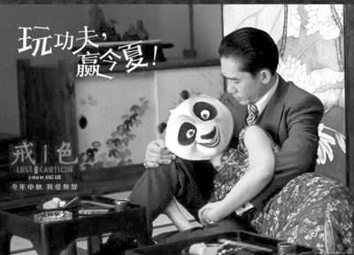 記者昨日在網(wǎng)絡(luò)上看到,熊貓版《色戒》的海報(bào)上,易先生懷里抱著的那個(gè)身材婀娜的王小姐變成了熊貓阿寶,好像梁朝偉本人都忍不住想看個(gè)仔細(xì),美人臉怎么變成了熊貓眼?熊貓版《功夫》中,腦袋上全是卷發(fā)棒的阿寶滿臉自信,“管他是斧頭幫還是鋤頭幫,有神龍大俠在此,誰(shuí)敢撒野!”至于熊貓版《加勒比海盜》,則是白霧茫茫的海面上,殺氣騰騰的阿寶帶了三大高手和師傅作勢(shì)前來(lái);熊貓版《哈利波特》中,那副可以遮住半張臉的黑框眼鏡還是遮不住阿寶的黑眼圈,瞧它一臉壞笑就知道伏地魔已無(wú)處可逃,功夫加魔法啊,該是多么強(qiáng)大!最暈的則是熊貓版《還珠格格》,看阿寶那張恐怖的大嘴,五阿哥這回可遭殃嘍。