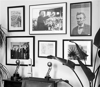 辦公室里有一面“英雄墻”,貼的都是他欽佩的歷史人物照片,其中有亞伯拉罕·林肯、甘地和他的紡車(chē)、馬丁·路德·金和約翰·F·肯尼迪。墻上還掛了一份加了外框的1963年華盛頓游行時(shí)日程安排的原始文件,金正是在那次游行過(guò)程中發(fā)表了《我有一個(gè)夢(mèng)想》的演講。