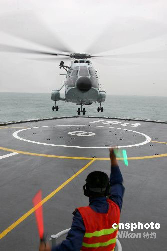 引導(dǎo)艦載機(jī)著艦。中新社發(fā) 汪漢宗 攝