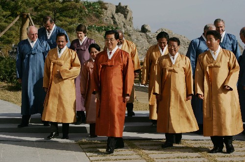 資料圖片:2005年11月19日,國家主席胡錦濤出席亞太經(jīng)合組織第十三次領(lǐng)導(dǎo)人非正式會議。圖為胡錦濤主席等亞太經(jīng)合組織成員的領(lǐng)導(dǎo)人身著韓國民族特色的服裝“圖魯馬吉”合影后,前往出席《亞太經(jīng)濟合作組織第十三次領(lǐng)導(dǎo)人非正式會議釜山宣言》的宣讀儀式。樊如鈞 攝
