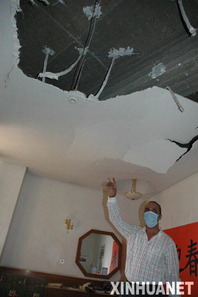 就在拿到相機(jī)轉(zhuǎn)身的一瞬間,第二聲巨響響起,整個(gè)大樓劇烈顫抖起來(lái),陽(yáng)臺(tái)的玻璃門爆裂,無(wú)數(shù)的碎玻璃打在記者剛離開(kāi)的辦公桌前。陽(yáng)臺(tái)上的衛(wèi)星電話、辦公桌上的英文字典和地上的垃圾桶被氣浪掀飛起來(lái),記者也被氣浪掀倒在沙發(fā)后。鋁合金門框整個(gè)砸到墻上。記者的頭頂碎石亂飛,天花板出現(xiàn)了3個(gè)大窟窿,落下的天花板砸在記者床上。樓道里傳來(lái)其他房間的天花板和門窗倒塌之聲,嗆人的煙霧充滿整個(gè)樓道。