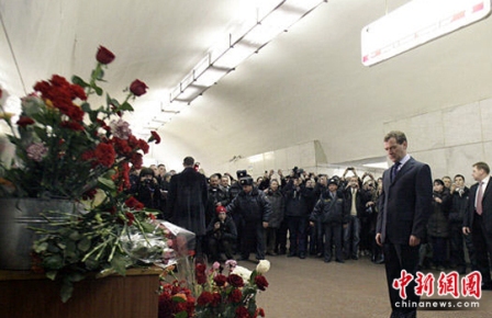人們在發(fā)生爆炸的“盧比揚(yáng)卡”地鐵站以及“文化公園”地鐵站設(shè)立了紀(jì)念處,向亡者獻(xiàn)上鮮花寄托哀思。俄羅斯總統(tǒng)梅德韋杰夫29日傍晚來到“盧比揚(yáng)卡”地鐵站獻(xiàn)花,并矢言將嚴(yán)懲發(fā)動襲擊的不法分子。
