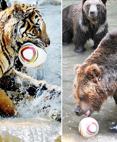 而在白天32度的高溫下,韓國京畿道龍仁愛寶樂園動物園的老虎和熊也不甘落后,它們使用2010南非世界杯官方比賽用球“普天同慶”興致勃勃的玩起了水上足球。