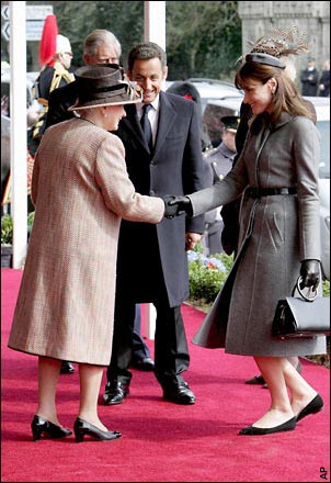 薩科齊夫婦隨后來(lái)到溫莎堡,英國(guó)女王在那里迎接他們到訪?ɡ·布呂尼向女王行屈膝禮,之前布呂尼已經(jīng)為這次見(jiàn)面準(zhǔn)備了很長(zhǎng)時(shí)間。薩科齊則在女王丈夫菲利浦親王的陪同下檢閱了英國(guó)皇家軍隊(duì)。