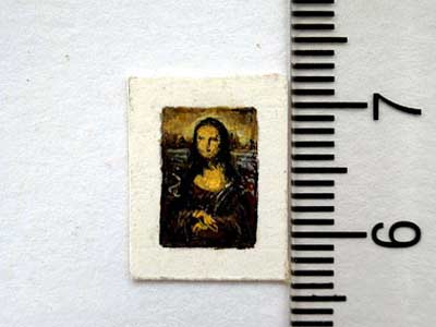 英國(guó)漢普郡一名藝術(shù)家日前繪制出了一幅世界上最小的《蒙娜麗莎的微笑》:11毫米長(zhǎng)、7毫米寬,大小看起來(lái)僅相當(dāng)于一枚普通郵票的四分之一。