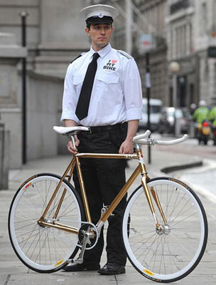 這輛自行車(chē)受英國(guó)環(huán)境運(yùn)輸協(xié)會(huì)委托定制而成,鏈條、座位、車(chē)把手都和普通自行車(chē)的一樣,不過(guò)表面卻鍍上了24克拉的黃金。由于在英國(guó),售價(jià)超過(guò)4000英鎊的自行車(chē)都不能享受保險(xiǎn)“待遇”,因此購(gòu)買(mǎi)這輛自行車(chē)的人還必須雇一位“保鏢”,在公共場(chǎng)合負(fù)責(zé)看管。