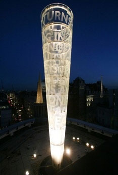 這座玻璃和鋼制成的圓錐形紀(jì)念碑位于英國(guó)廣播公司(BBC)大樓頂部,是在BBC的兩名記者早先分別在阿富汗和索馬里殉職后開始設(shè)立的。