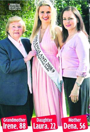 現(xiàn)年22歲的英國(guó)女孩勞拉·科爾曼在“英國(guó)小姐”選美大賽中擊敗其他49名決賽佳麗,一舉奪得了“英國(guó)小姐”的桂冠。然而鮮為人知的是,勞拉其實(shí)來(lái)自一個(gè)英國(guó)“選美世家”,她的外婆愛(ài)琳、母親迪娜都曾經(jīng)當(dāng)選過(guò)英國(guó)各個(gè)選美大賽中的“選美皇后”!