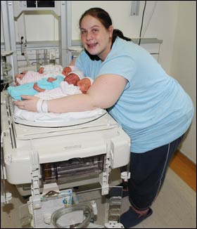 剖腹手術(shù)要做得特別精確小心,整個過程耗費(fèi)不少人力,特制鋼質(zhì)手術(shù)臺需要5位助產(chǎn)士、4個外科醫(yī)生、4個麻醉師及12個嬰兒顧問和護(hù)士等,共68人助陣。她只能麻醉下半身,因全身麻醉可能致命;其胃部亦要提起,以騰出更多空間取出嬰兒。最后她順利誕下2名各重4磅多的女兒,和一名5磅多的兒子,當(dāng)然這次重量級的生產(chǎn)也是耗資不菲,花了20萬英鎊,是正常費(fèi)用的4倍。
