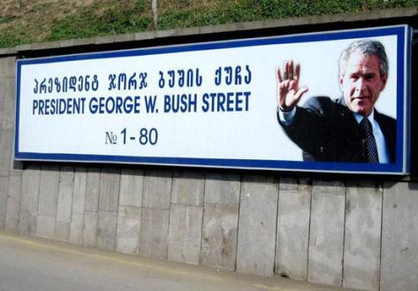 近日,有關(guān)格魯吉亞首都第比利斯有條街道名字叫“喬治·布什總統(tǒng)路”的新聞,在互聯(lián)網(wǎng)上不徑而走。據(jù)說這條街是2005年美國總統(tǒng)布什訪問第比利斯時(shí)命名的。當(dāng)年沒有太知名的事情,今天傳遍世界。布什揮手的大廣告牌立在這條街的顯著位置,圖像和視頻被各種博客和新聞網(wǎng)站迅速傳播開來。