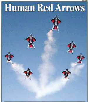 當(dāng)“Topgun”表演時(shí),16名隊(duì)員的飛行時(shí)速可以達(dá)到驚人的193公里,但每名隊(duì)員之間的距離有時(shí)只有幾英寸之遠(yuǎn)。他們猶如一只只巨大的蝙蝠在空中急速穿梭,并以密集編隊(duì)在空中翻飛并不停變換隊(duì)形,其技巧和真正的“紅箭”飛行表演隊(duì)不相上下,精湛技術(shù)令人叫絕,壯觀場(chǎng)面可謂酷到極點(diǎn)。但顯然和“紅箭”不同的是,他們表演時(shí)無(wú)須使用任何飛機(jī),全憑自己的身體在空中“肉搏”。