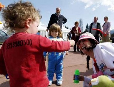 在另一處避難營地,一些紅鼻子的小丑跳起滑稽舞蹈,還有一些小丑吹起肥皂泡,向孩子們分發(fā)氣球,和他們一起玩游戲。
