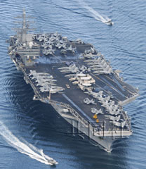 美國(guó)核動(dòng)力航母“里根”號(hào)駛?cè)腴L(zhǎng)崎縣佐世保港。(共同社圖)