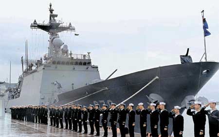 中新網(wǎng)3月4日電 據(jù)韓國《中央日報》報道,3日,將被派遣到索馬里海域的韓國海軍“清海部隊”成立儀式在海軍作戰(zhàn)司令部釜山基地舉行。清海部隊擁有一艘4500噸級驅逐艦“文武大王艦”、一架反潛直升機和30名履行訊問搜索任務的特戰(zhàn)人員等,加上文武大王艦上原有的船員,總規(guī)模達到了300多人。