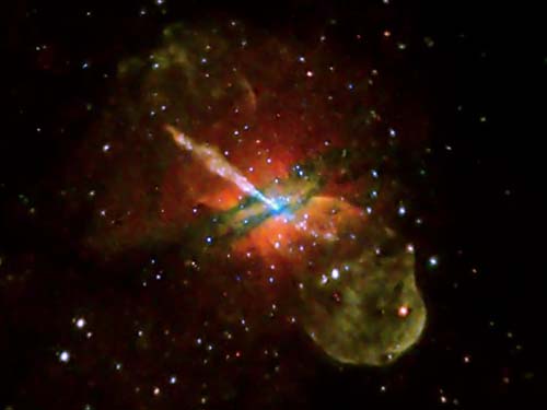 圖片中的左上角是一條延伸距離達(dá)1.3萬光年的X射線噴射物,以及一條向反方向延伸的較短的“反向噴射”。天文學(xué)家認(rèn)為,這種動力射流起到了重要的運(yùn)輸作用,把來自黑洞的能量傳遞到規(guī)模更大的星系,同時(shí)還影響那里恒星的速度。