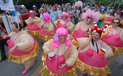 歷時(shí)10天的活動(dòng)里,彩車上的人們有的身著盛裝,有的扮成動(dòng)物,甚至有幾名女子打扮成前白宮實(shí)習(xí)生萊溫斯基的樣子,也有狂歡者站在花車上撒錢。