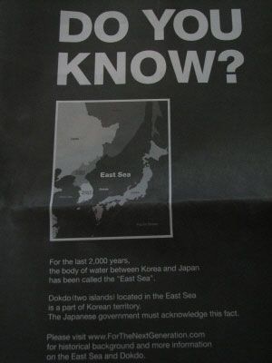 這一廣告刊登于《紐約時(shí)報(bào)》7月9日A15版,標(biāo)題為“您知道嗎?”(Do you know?)。廣告上刊登了朝鮮半島周邊地圖以及“在過(guò)去的2000年里,韓國(guó)和日本之間的海一直被稱為東海,位于東海的獨(dú)島是韓國(guó)的領(lǐng)土。日本政府必須承認(rèn)這個(gè)事實(shí)”的內(nèi)容。廣告中還建議“韓國(guó)和日本應(yīng)該讓下一代了解歷史的真相,同時(shí),兩國(guó)從現(xiàn)在開始就應(yīng)為東北亞的和平與繁榮共同努力”,并留下了韓國(guó)歷史宣傳網(wǎng)站“為了下一代()”的網(wǎng)址,以便讓《紐約時(shí)報(bào)》的讀者可以看到更詳細(xì)的內(nèi)容。