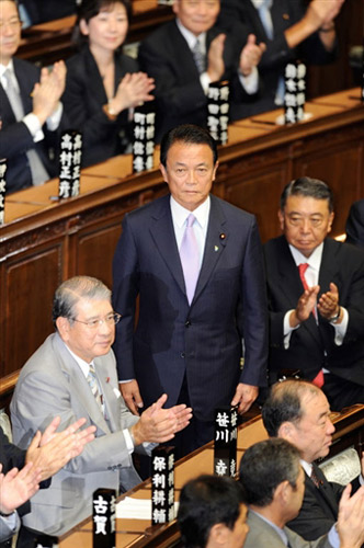 在當(dāng)天下午舉行的眾議院全體會議上,麻生太郎以三百三十七票當(dāng)選。而在隨后舉行的參院選舉中,小澤一郎經(jīng)兩輪投票以十七票的優(yōu)勢戰(zhàn)勝麻生當(dāng)選。之后,參眾兩院就新總裁人選進行磋商,但以失敗告終。按照日本憲法規(guī)定,兩院意見相左時眾院意見優(yōu)先,最終六十八歲的麻生太郎成為日本首相官邸的新主人。
