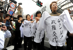 同時,日本在野黨民主黨派出了三位高官夫人——民主黨最高顧問、日本前首相羽田孜的夫人綏子、代表代行菅直人的夫人伸子、干事長鳩山由紀(jì)夫的夫人幸!叭蛉塑妶F(tuán)”身穿廚師樣式的服裝,上書“改變!政權(quán)替換”,來到東京巢鴨的購物街,和正在購物的家庭婦女一一握手。其間,一名60歲的老婆婆一臉郁悶,說“我已經(jīng)在很努力削減家庭開支了,可是國家還是在浪費(fèi)!比环蛉笋R上建議說,“下次讓民主黨執(zhí)政看看吧!”