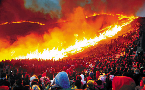 當(dāng)?shù)貢r(shí)間,9日晚6時(shí)15分許,慶尚南道昌寧郡昌寧邑火旺山(海拔757米)山頂附近舉行“火燒紫芒活動(dòng)”時(shí),在海拔742米的“舟巖”附近大風(fēng)突然改變方向,導(dǎo)致火苗越過(guò)防火線向游客方向蔓延過(guò)來(lái)。來(lái)不及躲閃的4名游客被火燒死,52人掉下懸崖受傷或被火燒傷。據(jù)了解,死者包括三名女性和一名男性。警方出動(dòng)180人搜尋死傷者,但由于夜已深,于晚11時(shí)左右撤離。警方將于10日上午出動(dòng)400多人再次展開搜救工作。
