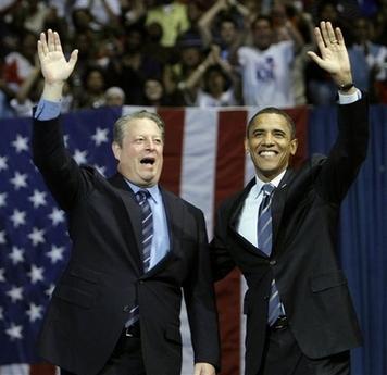 戈爾和奧巴馬當(dāng)天在集會上向支持者們問候。