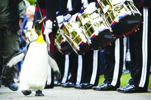 15日,企鵝尼爾斯在愛丁堡動物園檢閱挪威皇家衛(wèi)隊。
