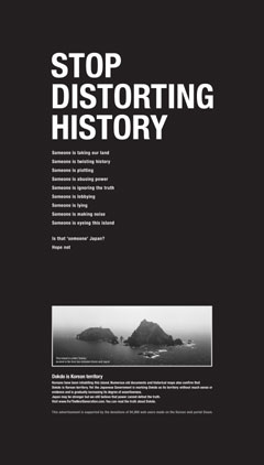 網(wǎng)民們還選定了廣告內(nèi)容。Daum從4日至12日,在網(wǎng)站公布了某廣告公司免費(fèi)制作的三個(gè)廣告試案,并征求眾網(wǎng)民意見(jiàn)。結(jié)果,58.6%的網(wǎng)民選擇了“STOP DISTORTING HISTORY(停止歪曲歷史)”這一廣告文案。