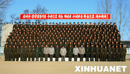 資料圖片:在這張朝鮮中央通訊社12月19日公布的照片中,朝鮮最高領導人金正日與人民軍955部隊指戰(zhàn)員合影。據(jù)朝鮮中央通訊社19日報道,金正日于近日視察了朝鮮人民軍955部隊司令部。新華社/朝中社