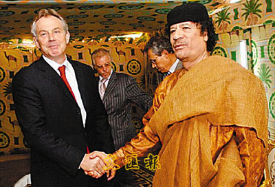 據(jù)香港《文匯報(bào)》報(bào)道,布萊爾在2004年3月到訪的黎波里,不但與利比亞領(lǐng)袖卡扎菲進(jìn)行歷史會(huì)晤,雙方還達(dá)成協(xié)議,讓英國調(diào)查員到當(dāng)?shù)卣{(diào)查1984年發(fā)生在英國大使館的一宗槍殺案。期間,卡扎菲把駱駝座鞍贈(zèng)送給布萊爾以示友好,更象征著英國把利比亞重新帶返國際社會(huì)。