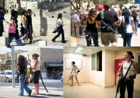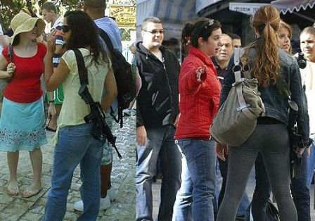 觀察蘿蕾博客上的照片可知,這些年輕女孩可能是陸軍士兵,從她們槍把子上面的紫藍色綢帶上看出來,有些是專業(yè)的M16步槍,屬軍用裝備,而非私人護身之用。加上以色列人不管男女都要服兵役,因此就算是回家休假槍也不離身,才能確保生命安全。