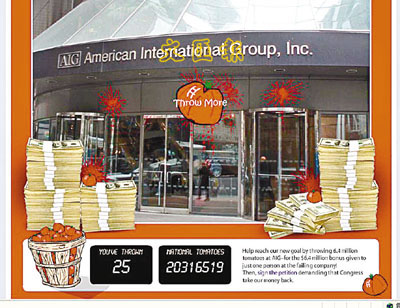 中新網(wǎng)3月25日電 據(jù)香港《明報(bào)》25日援引外電報(bào)道,美國AIG花紅風(fēng)暴,令民眾氣憤難平,自由派網(wǎng)站日前在網(wǎng)上開設(shè)“擲西紅柿”泄憤游戲。網(wǎng)民們可邊詛咒、邊瞄準(zhǔn)AIG大樓入口圖片狂擲虛擬西紅柿。