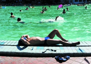 昨日,北京青年湖公園,一名市民在游泳池旁,享受著泳池的清涼和日光浴。當(dāng)天北京氣溫高達38℃。