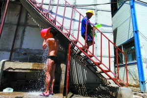 昨日,芍藥居一建筑工地宿舍區(qū)內(nèi),一名工人用水沖涼。昨日最高氣溫達到40.6℃,這是北京自1951年以來同期首次出現(xiàn)這樣的高溫。高溫趨勢今天仍然不減,氣象專家表示,北京城區(qū)氣溫今天仍將達到40℃。 薛珺 攝